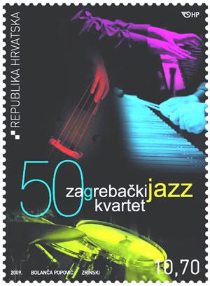 Motiv: Glazbeni instrumenti iz Zagrebačkog jazz kvarteta Godine 1959. Boško Petrović je utemeljio kvartet u kojem su svirali klavirist Zlatko Kružić, kontrabasist Zdravko Šatrak i bubnjar Ivica Gereg. U međuvremenu je Šatraka zamijenio Krešimir Remeta, a kvartet je krajem 1959. promijenio naziv u Zagrebački jazz kvartet koji je do današnjih dana ostao najznačajnijim sastavom u povijesti hrvatskoga jazza. Iste godine Kvartet su napustili Remeta i Gereg, a njihova su mjesta zauzeli kontrabasist Miljenko Prohasaka i bubnjar Silvije Glojnarić. Zagrebački jazz kvartet, koji je aktivno djelovao do 1965., a poslije se okupljao tek u posebnim prigodama, bio je prvi hrvatski jazz sastav s kontinuiranom djelatnošću koji je jazz glazbu predstavljao na visokoj estetskoj razini, promišljajući ju kao umjetnost. Bio je poznat po osebujnu pristupu, posebice zahvaljujući skladbama članova, nerijetko nadahnutima narodnom glazbom. Skladbe iz njihova repertoara poput Petrovićeve “With Pain I Was Born”, Prohaskine “Intime”, Kajfešove “Ornaments” i brojne druge, ostat će trajnom vrijednošću hrvatske glazbene baštine. Zagrebački je jazz kvartet bio poznat u cijelome svijetu, a jedini je hrvatski jazz sastav koji je imao ugovor sa stranim promotorom, njemačkom tvrtkom Lippman & Rau. Glazba Kvarteta izvedbama i samim skladbama u potpunosti je zadovoljavala visoke zahtjeve glazbene teorije i nailazila je na najveće priznanje publike, ali i glazbenih kolega iz tako zvanog klasičnog miljea. To je rezultiralo nastupom na Zagrebačkom Biennalu 1961., uz Zagrebački gudači kvartet, pod ravnanjem skladatelja Gunthera Schullera, te Borisa Papandopula, koji je za tu prigodu skladao suitu u tri stavka za gudački i jazz kvartet. Kasnije je Zagrebački jazz kvartet u nekoliko navrata nastupao i snimao s ansamblom Zagrebačkih solista. Kao jedan od najboljih europskih jazz sastava toga doba ostvario je suradnje sa slavnim svjetskim jazzistima, između ostalih s klaviristom Johnom Lewisom, pjevačem Big Joeom Turnerom, trubačem Buckom Claytonom, tenor saksofonistom Stanom Getzom i trombonistom Albertom Mangelsdorffom. Često je poduzimao europske turneje, svirao na mnogim koncertima i jazz festivalima, te je snimao brojne ploče za hrvatske, ali i inozemne izdavačke tvrtke svjetskoga glasa poput Philips/Fontana ili Atlantic, ostvarivši najbogatiji diskografski opus na polju jazza u Hrvatskoj. Diskografija Zagrebačkog jazz kvarteta upotpunjena je kompakt diskom “Zagreb Jazz Quartet in Concert” što ga je objavila tvrtka Jazzette Records, a donosi snimku nastupa u Heidelbergu 1965., kompilacijskim kompakt diskom “The Best Of Zagreb Jazz Quartet” u izdanju Croatia Recordsa s izborom snimaka s raznih albuma, te četverostrukim kompilacijskim kompakt diskom “40 godina, Zagrebački jazz kvartet 1959. - 1999.” u izdanju Croatia Recordsa s izborom snimaka iz domaće i inozemne diskografije, te radijskih i koncertnih snimaka. Nakon prestanka djelovanja Zagrebačkog jazz kvarteta, Boško Petrović, Miljenko Prohaska i Silvije Glojnarić su s trubačem Ladislavom Fidrijem i saksofonistom Ozrenom Depolom, te povremeno i američkim trubačem Artom Farmerom, djelovali kao Zagrebački jazz kvintet. Davor Hrvoj