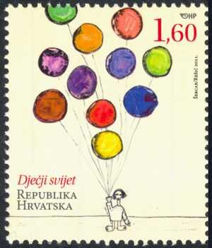 Motiv na marki: dijete sa šarenim balonima. Ovo je izdanje posvećeno Međunarodnom dječjem festivalu u Šibeniku. 50 godina pozivanja na igru i radost!