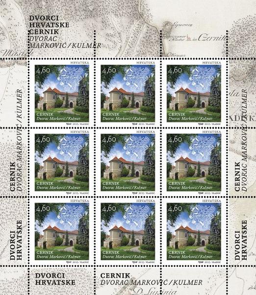 | Opis: | Motivi: dvorac Marković/Kulmer (Cernik), dvorac Janković (Daruvar), Stari grad (Đurđevac), dvorac Erdödy-Rubido (Gornja Rijeka) Marke su izdane u arčićima od 9 maraka te u zajedničkom arku od 8 maraka (2 x 4v) i s 8 privjesaka, a Hrvatska pošta izdala je i prigodnu omotnicu prvog dana (FDC). |
