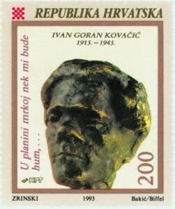 Motif: "Ivan Goran Kovačić", statue by Vojin Bakić. Ivan Goran Kovačić, Croatian poet, short-story writer and critic was born on March 21, 1913, at Lukovdol, Gorski Kotar. In 1936, Matica hrvatska published seven short stories of the 23 years old writer entitled "The Days of Rage". His first volume of verse "Fires and Roses"shows an even more complete return to the reality of his native region, to childhood emotions, and to reflection on fateful events. At the end of 1942, Ivan Goran Kovačić joined the National Liberation War together with the writer Vladimir Nazor, feeling that in this way he would be able to promote the Croatian cause. He took the manuscript of his well-known epic poem "The Pit" (Common Grave) written in classic verse strongly influenced by Dante. The poem is a heavy condemnation of crimes against man and mankind. Goran was killed by a chetnik captain (most probably July 12, 1943) "in Avdo's Valley, below Kruščić Hill, on the right bank of the Drina River near Bunovi hamlet not far from the city of Foča". Goran was buried July 13, at noon, just as he foresaw in his prophetic lyric "My tomb", far from his native land, far from any human settlement, in the woods among the trees which were to hide him forever under their dense folliage protecting his last resting place. Although Goran was only 30 when he died, his literary inheritance is interesting and priceless. The stamp was printed in sheets of 20 pieces each. HPT issued a first day cover (FDC) and a commemorative sheet.