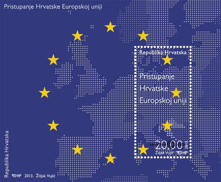 | Description: | Stamp in the value of 3.10 HRK has been issued in so called Croatian sheet (25 stamps in 30 fields) and the stamp in the value of 20.00 HRK has been issued in souvenir sheet. Croatian Post has also issued two First Day Covers (FDCs) and a commemorative album. The stamp and souvenir sheet are offset-printed with the application of innovative infrared technique, which enables the “image in image” effect. In Croatian sheet, under infrared light, in the background of the stamp, Croatian coat of arms and stars from the EU flag and on the souvenir sheet first two strophes of the national anthem of the Republic of Croatia are visible. |