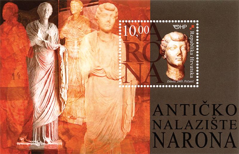 Motif: marble sculpture of Livia Drusilla, AD 14 to 21, Narona, Vid-Metković, Croatia; the head of the sculpture is the property of the Ashmolean Museum in Oxford. The city of Narona (now the village Vid near Metković, Croatia) was an important Roman colony in the Neretva river valley, on the eastern coast of the Adriatic. Though Salona unquestionably used to be the centre of the Roman province of Dalmatia, since the Late Republican era Narona played a more significant role in relation to south-eastern Europe, connecting the coast with the interior (particularly the area of the present-day Bosnia and Herzegovina). Narona was first mentioned in historical documents as early as the fourth century BC by Pseudo Scylax and Theopompus, however in the mid-second century BC, according to archaeological excavations from 1997, 1998 and 1999, there was an archaeologically attested emporium located at the top of the Neretva river delta (Roman Naro, Greek Naron), on the very spot where the Roman forum of the Narona colony was to be built in the last decades of the first century BC. This place was of strategic importance for the communication from the Adriatic toward the hinterland of the ancient province of Dalmatia, as far as the rivers Sava and Danube. Narona was probably given the status of colonia, a colony, by the emperor Augustus, though there is another rather well founded opinion that it had already been a Julian colony, i.e. earlier than 27 BC. The city walls with towers were preserved. A number of partially explored country houses, (villae rusticae) in the immediate vicinity of the city walls show a considerable degree of interior decoration. The necropolis (burial grounds) from this early ancient period was not investigated, though many Roman Latin epitaphs were preserved. The most impressive building on the wide forum is the Augusteum, discovered and excavated in 1995 and 1996, at the locality of the former Plećaš’s barn. This small temple, with a cella and propyleaeum, on a raised plateau next to the forum, exactly at the spot where the Lower and Upper city meet, had been erected for emperor Augustus round 10 BC. This is also the time when the first statues in its interior with a simple black and white mosaic-covered floor had been erected. These statues were erected on a constructed pedestal. It can be concluded that the Augusteum was destroyed in the late fourth century. The whole of the forum complex was already deserted. Some Christian basilicas were constructed in the Lower city. The Augusteum at Narona, with its 15 preserved large statues out of, probably, the total of more than 20, represents the most numerous group of Roman imperial statues that have been ever found. Beside the statue of Livia from the Augustan period, by the new discovery of the head and torso join – shown on the Croatian Post postage stamp – another statue of Livia was also discovered, this one from the Tiberian period, 14 – 21 AD. The statue is 184 cm high/tall. The torso is made from Pentelic marble and the head Parian. Livia Drusilla, born in 58 BC, died in AD 29, was first married to the Roman military leader Tiberius Claudius Nero and was the mother of emperor Tiberius and the military leader Nero Claudius Drusus. In 38 BC she married Octavianus, the future emperor Augustus. The imperial governor (pro-praetor) of the province of Dalmatia, Publius Cornelius Dolabella simultaneously erected two statues in Narona, the statue of Tiberius and the one of Livia, the latter now known under the name “Oxford-Opuzen Livia”. Livia as the emperor’s mother had been highly honoured, more than she had been in the Augustan period. When she was finally deified at the time of Claudius in AD 41, her cult in Narona has been built up even more, as a matter of fact two inscriptions from that time mention her priest as sacerdos Divae Augustae. Livia’s cult in Narona, even before this discovery, was attested by inscriptions as well as the portrait exhibited at the Ashmolean Museum in Oxford that was acquired for the museum by Sir Arthur Evans in Metković in 1878, (it was previously noted by Mihovil Glavinić in 1874). The marble head of Livia from the Ashmolean Museum, University of Oxford, has been on a several-year loan to the Archaeological Museum in Split where it had been exhibited since December 18, 2000, thanks to the museum board, the Visitors of the Ashmolean Museum, and their director Dr Christopher Brown and the curator Professor Doctor Michael Vickers. By this generous contribution to the evaluation of Livia’s portrait and statue, the collaboration of the two museums has been pointed out, the collaboration between the oldest British and north-western European museum Oxford, and the one in Split, the oldest Croatian and south-eastern European one. Endeavouring to find the torso that would correspond to the Oxford head has lasted for a long time and caused great media attention, both in Croatia and Britain. In the London The Times four articles were written by Norman Hammond, professor at Boston University and The Times archaeology correspondent: How a murderous matriarch lost her head, October 25, 2000; Oxford thrilled by headless torso discovery, November 22, 2000; Two heads of Livia are better than one, April 4, 2001; Body of evidence resolves the mystery of Livia’s head, June 20, 2001 On January 22, 2001 it was undoubtedly attested that the join of the Oxford head and the torso of the statue that was kept in Opuzen was perfect. The Opuzen torso was discovered earlier than the year 1847 in Narona, most probably together with another statue, the one of Tiberius, later attested to have come from the Augusteum. The torso was first mentioned by Sir Gardner Wilkinson who had seen it in Opuzen and wrote about it in 1848. The director of the Archaeological Museum in Split, Mihovil Glavinić, who noted the heads of Livia and Mercury in the autumn of 1874, also saw the torso in the same year. The statu