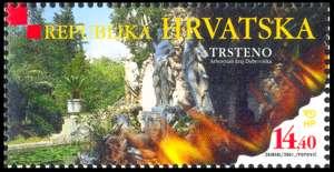 The First Day Cover (FDC) was also issued. Motif: The commemorative stamp features the Neptune fountain with spring water and a part of the old Renaissance park which is still the optimal representative of the present-day picture of Trsteno. Trsteno - the Renaissance garden, later arboretum, was planted at the end of the 15th century and the beginning of the 16th century around the summer villa of the well known Ragusan noble family Gučetić (Gozze) at the time of the flourishing of the Ragusan Republic. The additional reason for the placement of the garden and the villa was the water spring; the name Trsteno is derived from trska, the Croatian name for the reed growing near the water. The original appearance of the gardens entirely expresses the Renaissance skill of garden layout practised by old Ragusans. Following soon after the advent of the first Florentine Renaissance gardens, before those planted in Rome, the citizens of Dubrovnik embraced the new joy of living in re-shaped nature. They added the refined measure of harmony with the surrounding nature to the Florentine model, and enriched the garden with useful content (trellised grape arbour, fishpond instead of a fountain, etc). There is a stone tablet originating from the year 1502 with a carved inscription ordered by Ivan Gučetić, together with his signature on the tablet. This inscription is the best proof of this spirit: "I am proud of my neighbours, but I am more proud of the water, the healthy climate and the work of the serene master. Here, traveller, you can find evidence of man's toil, where worthy art enhances wild nature". "Worthy art" has contributed to the creation of a specific style of the Ragusan Renaissance garden, not yet known well enough in the European art of garden layout. The simplicity of this Croatian monument of gardening architecture, indicatively named "The Croatian green cathedral", can be proved by the existence of a number of most significant styles of European gardening art: the Renaissance foundation is followed by the sequence of the Baroque Neptune fountain (from the year 1736), while quite recently a part of the original nature has been ennobled by the image of an English natural garden with a Romantic atmosphere (this part was almost completely burned down in the last great fire). The arboretum Trsteno has been registered as a monument of garden architecture in the ledger of protected natural objects on October 27, 1962 with its area of 28.55 hectares. Trsteno has been burned down twice in the recent past: first, during the Croatian War of Independence, on October 4 and 5, 1991, and then in the disastrous fire on August 27 and 28, 2000. Trsteno is being managed by HAZU, the Croatian Academy of Science and Arts, after the last count, Vito Gozze, issued the deed of gift by which he gave the estate of Trsteno to the Academy in 1948. The Academy founded a Restoration Committee on March 1, 2001 with the aim accomplishing an overall restoration of both parts of the gardens, the Renaissance part and its Baroque sequence, as well as the burned down English part of the park that is by its structure very close to the arboretum status - primarily with the aim of scientific-expert research of the acclimatization of foreign species of shrubs and trees to our Mediterranean climate. In this way such a definition of the completeness of Trsteno as an object of garden architecture and an arboretum will offer an unavoidable contribution to the future of Croatian tourism.