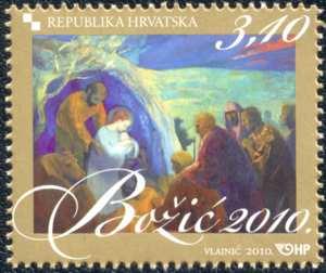 Motif: Adoration of the Shepherds, Josip Biffel, Gallery “Šimun” of the Franciscan Monastery of St. Anthony, Dubrave near Brčko, Bosnia and Herzegovina Christmas lasts. Already for 2010 years the Child is born into its death and resurrection. Ever since the world has been counting time from this birth, the scene of birth was being complemented and enriched. Apart from the main characters, there appear and exchange also the episodists; metaphors gain bodies and the warm muteness of animals completes the human register. The spirit of time arranges the story, lavishing presents and deducing the story to essentials. The styles and epochs have been exchanging round the stall, but never disregarded it. Many painters and sculptors have brought the goodness of their lives, dear lineaments of their wives and children, their next of kins and even their own into the scene of birth. By one’s own experience or longing anyone could settle in this scene. It survived also the chase of narration in modern times. A new, sometimes stiff emotion has carried over the torches of Bethlehem into our time. The painter Josip Biffel (born in 1933, graduated from the Academy of Fine Arts in Zagreb in 1959 in the class of Đuro Tiljak, professor at the same Academy) is among many who bowed in front of the stall. He did it in a modern way, renouncing the tiny details and filling out the space of great expansibility by the magic of light. The blue darkness of the sky and the little cave, the caring Joseph and animals in it, the reflection of light across the distant country, the night behind the shoulders of modest characters who had heard the call and have come to admire the new life, the shine on the mother and child, on the crown of a magical tree dialoguing with heavenly voices and the unusual purple sent off by the night – so could maybe Biffel’s painting be translated into word. Biffel has not taken that much with him from his professor at the Academy, much more has he exchanged with his contemporaries, with Ivančić, Stančić, Lesiak…A great part of his work he devoted to sacral motifs and especially to sacral spaces of Bosnia and Herzegovina. Creation of space, investigation of its dimensions, rotating of horizons, compression or extension of deepnesses are main features of his poetics. Exactly his paintings concerned with space are probably his most own and finest works. And this space is filled with colours that carry light and darkness, that replace the description by their shine and glowing. The Gallery “Šimun”, housing Biffel’s painting together with seven hundred and twenty other Croatian modern works of art, from which also this year’s Christmas stamp comes, is the collection of the great Franciscan collector, Fra Stjepan Pavić. It is also one of the most beautiful collections of Bosnia and Herzegovina and also Croatia which contributes to understanding and defining of not only our but also universal homeland. Željka Čorak