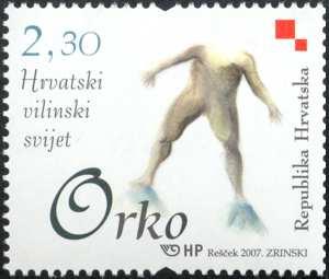 The sequel to the series of postage stamps under the name Croatian Fairy World introduces two exceptional motif novelties: the monster orko and the little devil macić who, in the reflections about the pagan inheritance, belong to the folklore demons. This means – as the contemporary Croatian folklorist Ivan Lozica explains – that they are “creatures like people, impetuous and unpredictable, in a way both of them are on the other side of the good and evil. Macić is a bit better than orko, he often helps people to find their way to money or he protects them from some disaster. Both of them, though, frighten people and can even harm them” (Pagan Heritage, Zagreb, 2002). Though they are mentioned by the folklorist Antun Ilija Carić in his work Popular Belief in Dalmatia (1897), these two creatures have scarcely made an appearance in written literature, not even in children’s literature, but have remained in the area of oral literature. Trying to find an answer to this surprising fact, Ivan Lozica offered a really contemporary solution: “There is a possibility that their demoniacal and protean characteristics have not allowed them to be transferred into fairy tales and stories (though Orcus is well known in German classic and romantic literature, and Orco is a frequent figure in the Rumanian fairy tales); they might have been too inconstant and ethically ambivalent to make a career of literary figures. I suppose there might also be some other possible reasons for their being disregarded. They are creatures of non-Slavic origin. We can find them in Croatia and Slovenia but, for instance, they cannot be found in Serbia. As they cannot be found in all the south-Slavic areas, they are considered not to be autochthonous, “ours”. They are thus perceived to be a foreign influence, though they were possibly in these regions even at the time of the arrival of the Croats to the Adriatic. Could demons be politically objectionable, could they even be victims of ethnic cleansing? Why should macić, who used to be a common and most frequent nightly scarecrow in Dalmatia some hundred years ago, be almost unknown?” From the great amount of recorded variants of orko and macić we have selected the most attractive ones. Orco in Istria is, therefore, the nightly headless giant who stands with one leg on a dry stone wall, and with the other on the second one, while macić in Velo Grablje on the island of Hvar is a child with one leg and a small red cap that turns round in the flame.