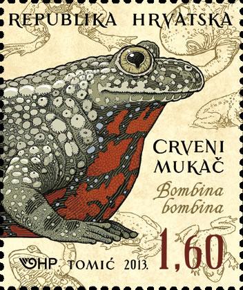 Fire-bellied toad or Bombina bombina (Linnaeus 1761) is an amphibian living in lowland habitats throughout central and east Europe from Denmark to Sweden in the north-west to Ural in Russia and Turkey in the south-east. It can mostly be found in lakes and ponds that do not dry out and in flooding lowlands overgrown by thick vegetation. It resides in shallow waters or close to the shore of typically clear standing waters, although it can be found in slowly flowing waters as irrigation canals. In the period of pairing, during day or in twilight the males stretched out on water surface emit sounds in order to attract potential partners. If they are successful, they will embrace a female with front limbs and fecundate eggs which the female most often lays among water plants. After hatching, tadpoles usually mostly feed on seaweed and after turning into toad they start to catch water insects and other invertebrates.
