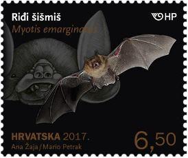 | Description: | Motifs: Blasius's horseshoe bat 2.80 HRK Mediterranean long-eared bat 3.10 HRK Redhead bat 6.50 HRK Stamps have been issued in 20-stamp sheets and 10-stamp booklets and there is also First Day Cover (FDC) and three Maximum Cards issued by Croatian Post. A bat silhouette is visible under UV light. |