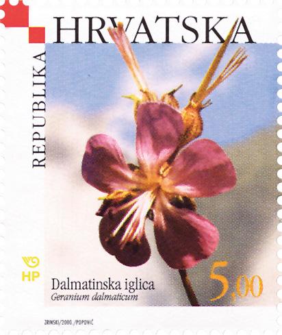 The postage stamps have been issued in a combined edition in a 20-stamp sheet, and individually in two stamp booklets of ten stamps each. The Croatian Post issued First Day Cover (FDC). GERANIUM DALMATICUM belongs to the genus of Geraniums, from the plant family Geraniaceae. The name of the genus originates from the Greek word geranos which means crane (on account of the bill-shaped fruit). This plant is a Croatian endemic species, and it grows on the peninsula Pelješac where it was originally found and described as a new species. The Geranium dalmaticum is 10 to 15 centimetres high and grows in larger clusters. It has a mild and pleasant smell and is honeyful. All the leaves are placed at the base of the plant, they are small, kidney-shaped to round, pentapartite, smooth, of a fresh green colour. The flowers are beautiful and attractive and consist of five sepals and five overlapping delicately pink petals. They blossom in June and July. The Geranium dalmaticum is a Mediterranean plant from the area along the sea. It can be found in the calcareous sandbanks, in the rocky crevices and among the crags, as well as in the limestone cracks and karst valleys. In Croatia it mostly grows in its natural locality, in the forests of the Dalmatian black pine. At 200 to 900 metres height above sea level, souther and northern exposures, it creates dense pure assemblages of a few square metres. As an endemic and rare species, the Geranium dalmaticum is endangered as it grows on a very limited area. Because of its decorative appearance it is endangered by the plant collectors. Its habitat should be proclaimed a botanical reserve and thus be protected.