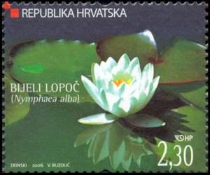 White water lily (Nymphaea alba L.) Family Nymphaeaceae English white water lily, white lotus German Weiße Seerose, Wasserrose French nénuphar blanc Italian ninfea comune The white water lily is a freshwater earth-like perennial without a stem. The rhizome spreading wide into several hard roots is laid horizontally in the muddy underwater soil and sends up shoots from which large, leathery and egg-shaped to circular leaves grow up some 30cm in length. All the mature leaves have shiny dark-green blades, purplish on the bottom and they float on the water surface (sometimes they may stand a bit above the water) split to long, tenacious stalks, round in cross section. Their subtly sweet-scented radially symmetric flowers are hermaphrodite (they have both male and female organs), individually they are large (up to 20 cm in diameter), open almost the whole day and often rise out of the water. Four greenish sepals are insignificant-looking compared to the 20-odd shiny white (rarely pink or reddish) petals that keep decreasing toward the centre, gradually turning into many stamens with yellow anthers and filaments. The ovary is sunken into the receptacle and is built of 12 to 20 ovules. The fruit with a multitude of seeds, nutlike and some 3 cm long ripens under water, and the elliptical seeds get distributed in the water where they are often food for fish. The water lily prefers sunny positions in stagnant and slow-moving waters of Europe, north-western Africa and the Middle East, where it blossoms from June to September. It can endure great yearly oscillations of the water depth and can survive in almost all entirely drained borders of marshes. Te water lily rhizome is sometimes used as food, boiled or fried (as it is rich in starch), and in the First World War it was used as the source of the anaesthetic nymphein. However, this plant has for a very long time been considered to be a highly appreciated decorative plant, so a great number of cultivars have been developed, in various colours and with different sizes of the flowers. Similarly to the yellow pond-lily, the water lily can also be found in watery habitats of Croatia, but by the drainage of these areas both species keep slowly vanishing.