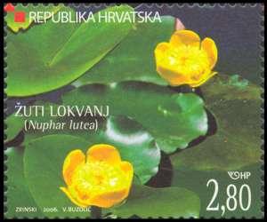 Yellow pond-lily (Nuphar lutea (L.) Sm., in Sibth. et Sm.) Family Nymphaeaceae English yellow pond-lily, spatterdock German Gelbe Teichrose French nénuphar jaune Italian ninfea gialla The yellow pond-lily or spatterdock is a freshwater earth-like perennial embedded in the muddy soil by the widely spread thick rhizome (8 cm in diameter), which is the favourite food for many animals. It has no real stem, but the elongated heart-like leaves grow out directly from the long stalk attached to the rhizome. The leathery surface leaves are up to 30 cm in length, green to almost dark brown, and they grow on long stalks (sometimes up to 3m long) with a triangular cross section. The underwater leaves are on short stalks and are almost translucent. The flowers with their faintly alcoholic fragrance are hermaphrodite (they have both male and female organs), they grow individually and are large (up to 6 cm in diameter), with protruding calyxes with circularly spread-out floral parts. Five yellowish-green sepals are bigger (up to 3cm) and live longer than the numerous yellow petals adhering below the pistil. The stamens are numerous and yellow and the ovary is in superior position to the receptacle and is built of 5 to 20 ovules. The fruit are large pods (3 to 4 cm long), which ripen on the water surface and are filled with numerous smooth seeds that get distributed in the water. In various cultures the rhizome of the spatterdock was used for medicinal purposes (as poultice to treat boils and abscesses and as an anaphrodisiac) and more rarely as food. The plant likes sunny places in stagnant of slow-moving freshwater. It is spread along the warm and temperate zone of the whole of the Northern Hemisphere (except for its coldest parts), where it blossoms from April to September. In Croatia it is still a relatively frequent plant, though it is getting more endangered by the diminishing of the marshland, like all other species of the aquatic vegetation.