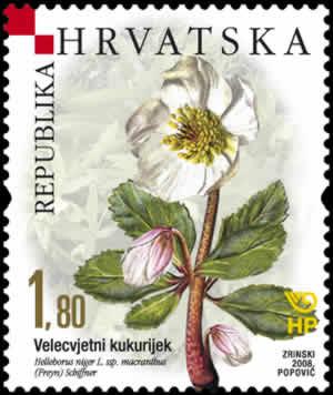 Christmas rose (Helleborus niger L. ssp. macranthus (Freyn) Schiffner) order: Ranunculales family: Ranunculaceae (buttercup) local, popular names: all names refer to the colour, the time of blooming – from late autumn to early spring, often in snow. English name: Christmas rose, hellebore German name: Schneerose French name: Hellébore The genus Helleborus (hellebore) is represented in the Croatian flora with 10 species and several subspecies, and the Christmas rose is definitely one of the finest species of this genus with its very noticeable appearance. The Christmas rose is an upright plant with the stem reaching up to 15 cm. The stem is almost bare, either not branched out or branched out into two short branches with dark-green leaves growing near the ground that endure the winter. These leaves are significantly leathery and have long cylindrical stalks and the leaf blade consisting most often of 7 to 9 wide inverted lanceted petals whose teeth protrude laterally on the edge. The central leaf petals are mainly whole while the lateral ones are sole-like joined or cut out into two or three wedge-shaped shoots. The leaves of the stem are significantly simpler, smaller and lighter in colour. The black-brown gnarled underground stem is more or less placed horizontally in the ground, with fibrous roots that develop in bundles. The plant has one to three big flowers with the diameter of up to 11 cm whose egg-shaped leaflets of the perianth are mainly white. On the outer side they are pale pink and after having blossomed they chiefly become reddish or purplish. Between the leaflets of the perianth and the numerous yellow stigmas there develop many two-lipped, tubular-broadmouthed, yellow-green nectaries. In the middle of the flower there are 5 to 10 fertile leaflets mutually grown together only by their basal part. From these there develop fruit bubbles, filled with many black, netlike, wrinkled seeds. The plant is poisonous but also with some healing properties. It contains glycoside helleborin and saponin. The plant sometimes starts blossoming from January onward, but it mostly blossoms from February to March. The abundance of nectar and the noticeable flowers attract early pollinator insects The plant grows on neutral and weakly basic, permeable and dry soil like the rendzine and some brown soils. The Christmas rose is a characteristic element of the Illyrian beech forests, mountain beech forests and beech-and-pine forests. This plant is endangered by the excessive gathering and is consequently protected by law.