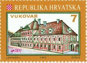 In the series of postage stamps entitled "Croatian towns" HPT-Croatian Post and Telecommunications issued a regular postage stamp -Vukovar-. Motif: The Baroque castle of the earles of Eltz (built in 1790.) in Vukovar. Vukovar (pop. 32 640) city and inland port in W. Syrmia at the confluence of Vuka and Danube rivers, inhabited since the Neolithic, boasts several important archeological sites from the older Iron Age and the early Middle Ages when there was a fortress Vukovo. The Roman Catholic parish church in Vukovar appears already in 1251 (in parochia de Walko). The 15-century Vukovar is a possession of princes of Gorjanski and Talovac. After a spell under Turkish rule (1526-1687) Vukovar becomes centre of the Comitat of Syrmia (1745). Its Baroque buildings include the Franciscan monastery, a parish church with an impressive array of altars, paintings, statues and dishes (15th through 19th cts) the castle of the earles of Eltz, the Comitat building, the old Post Office and a main street with its numerous Baroque buildings and picturesque arches. There are several precious archaeological sites in the vicinity: The Celtic and Roman remains in Dalj, Neolithic culture of Vučedol (2150-1850 b. C.), Sotin with its Neolithic and antique excavations. During the heroic defense of Vukovar in autumn ’91 the federal army and the cetnik units destroyed the town completely. In 1997 Vukovar was peacefully reintegrated in the Republic of Croatia. The stamp was printed in sheets of 50 peaces, and HPT issued the envelope of the first date of issue (FDC) and a commemorative sheet of paper.