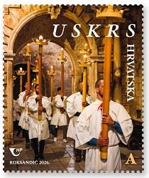 This year’s Easter stamp of Croatian Post depicts a procession of confraternity brothers in traditional attire (tonige), carrying torci, wax candles that can weigh up to eighty-five kilograms and reach heights of up to two and a half meters.