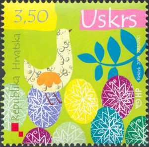 Motif: artistic creation of Easter iconography Presence of an egg in the Easter iconography has its origin in the ancient question: What came first the hen or the egg? To be sure, the question in reference to a present case refers to the binomial theorem of life and death and every existence crucified within. The privilege of dying have only those who lived; life is granted to those who passed through the gates of death. Good Friday and Easter Sunday are inseparable. They represent a promise and fulfilment of life, they bind together suffering and hope and guarantee the meaning of human existence. Easter is the most sacred of holy days in Christian ecclesiastical calendar, significant religious holiday in the church year representing utmost earnestness and a genuine joy. Nevertheless, an everlasting child in our soul is without fail brought to life by Easter festivities, and the human soul gladly becomes partial to joy. Although an egg has to be broken in order to start a new cycle of life, it represents an attribute of a religious holiday standing for promise – as long as intact, and inside the egg we can sense a process of growing, pulsing, pecking, while its perfect shape accommodated in a palm gives indescribable pleasure. Easter, celebrated by Christians is a significant holiday of promises and meaning, representing celebration of rejuvenation of nature: with buds, lambs, rabbits, chirping and gurgling. On the top of it all the egg represents perfect concentrated meaning of a holiday. In order to bring forth its message, it is transformed from nature into art: hand-painted, decorated with „words“ or simply „scribbled on“. In our parts a decorated Easter egg is called “pisanica”. The industrial era pushed back the old ways of egg decorating and you can buy ready made dyes and decorated stickers for the occasion. Nevertheless, still the anion rinds, red beet juice, saffron pollen, spinach leaves, are used for egg painting and with soft brown, red, violet ,yellow and green shades create a dialog between vegetable and animal kingdom. Not to mention various skills of impressing leaves and blades on egg’s shell, and wax painting techniques! The egg itself symbolises good wishes. Placed against a green background of a silky meadow or a table-cloth or simply surrounded by a new air with a tiny Easter twig and a chick cracked out of a shell, hand painted by the artist Sanja Rešček, the egg- the entire design – reach out with a warm Easter message of the Croatian Post