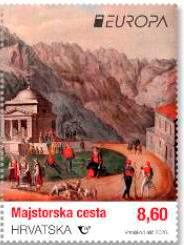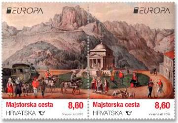 Old postal routes - the old road Majstorska Cesta Trusted and timely news have always been an important factor in the initiation and development of all the important processes in human society. The prerequisite for any organized transfer of news is existence of good, passable roads, which is why the history of old postal routes in Croatia corresponds largely with the history of old Croatian roads. It was during the mighty Roman Empire, which was famous for its system of well-organized and well-maintained roads, that the territory of modern-day Croatia got its first good-quality roads. Roads that passed along the valleys surrounding the rivers Drava and Sava in the then-province of Pannonia, as well as those that stretched along the Adriatic coast in the province of Dalmatia, were traversed by a courier service called cursus publicus. Roman roads were carved deeply in the landscape of this region and they were used for centuries after the fall of the Roman Empire, enabling the movement of goods, people and news. Ever since the earliest times, the biggest challenge in terms of transport was how to connect Croatian continental and coastal regions, which implied passage over the mountain range of Velebit. Around the 16th century, transport connections in this part of Croatia were threatened by constant Ottoman raids and conquests. After the Ottomans were banished at the turn of the 18th century, the Monarchy entered into a period characterised by development of commerce and transport, which included the traffic connection between the Pannonian region and Northern Adriatic, partly by waterways, along rivers Sava and Kupa to Sisak and Karlovac, and from there in the form of caravan traffic towards Bakar, Rijeka and Senj. Within only a single century, a series of important mountain roads were built on major mountain passes of Velebit. The Karolina Road, which connected Karlovac and Rijeka in 1728, enabled significant growth in the transportation of goods, but also a growth in postal services, which is the reason why this road is often referred to as the Postal Road. In 1779, the Josephina Road connected Karlovac and Senj, but one of the most cutting-edge mountain roads in Europe at the time was the Louisiana Road, which was completed in 1811 and stretched from Karlovac to Rijeka. These macadam (crushed stone) roads were designed so that two carriages or stagecoaches can pass by each other at any section of the road. There used to be milestones placed along the roads, spaced apart at the distance of one Austrian postal mile (7.5 km), and their remnants can still be seen today. An example of excellent construction skills is the Majstorska Cesta road, going over Velebit and connecting Zadar and the region of Lika along the Obrovac – Podprag – Mali Alan – Sveti Rok route. It was built from 1825 to 1832 and it is considered the first modern road that connected continental Croatia and Dalmatia. It was designed by a famous road designer of the time, Military Frontier officer Josip Kajetan Knežić. Owing to the exceptional quality of design and construction execution, this road was dubbed “Majstorska Cesta”, which means “Master Roadbuilder's Road” in Croatian. By end of 1833, there were weekly stagecoaches going from Vienna to Zadar and back. Majstorska Cesta road was included in the List of Protected Cultural Goods of the Republic of Croatia in 2007 and it is one of only a few old Croatian roads that have kept their original form. The colour lithograph shows a motif from the Majstorska Cesta road: St. Francis Chapel in the village of Podprag, and a stagecoach in front of the chapel with the postillion blowing a post horn. The lithograph is the work of an unknown artist. It was printed by the Antonelli Printworks and is kept nowadays in the State Archives in Zadar. The chapel was built in honour of the then Emperor Francis Joseph and it was dedicated to St. Francis of Assisi. It was designed in the classicist style by Italian architect Valentino Presani. A commemorative plaque was installed inside the chapel in 2001 in memory of Croatian soldiers who lost their lives defending outposts across Velebit during the Croatian War of Independence. Vesna Lipovac HT Museum, Zagreb