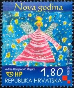 Motif: Angel surrounded by snow flakes and stars We all know what Christmas means: a collective joy of the family table, the window glass membrane that separates our time from everybody’s history, readiness to play oxen and donkeys to each other and use our breath to warm up creatures precious to us, humble clarity that we recognize as real wealth in the gold of the straw under the newborn child... The Christmas angels warn us that it is gloria in excelsis, “Glory be to God on high” and what is befitting for the earth then is modesty and peace. It would be hard not to notice that New Year is not only something entirely different but, moreover, something quite opposite. Personal time actually desires to blend with the general history, the table is sought outside the home and is shared by many, wealth glows with the sparkling brightness of silver and gold, from the real one to the surrogate... New Year is loud and multicoloured, in full swing and racing, a geyser of light for naive eyes. It is the time of the last acceleration; it is the exorcism of transience. We mercilessly rejoice in the flowing out of the old year, as if we were casting aside a domestic animal that had served us to exhaustion. Because afterwards arrive the Emperor’s new clothes, something young, new, fresh, open to every expected good thing. Indeed, regardless of the fact that in this paroxysm of transience con brio there is something irrational, some voluntary blindness and some dancing challenge for man’s fate - condition humaine, New Year is the feast of having confidence in chance. Everything starts from the beginning. Under the snow-covered moss the Christmas rose starts pushing through the earth. In the silence of the day fallen asleep after the sleepless night one can hear the bird’s little legs touching the branch. Or some person’s foot trundling a can. Everything is open. Everything can happen. Everything can be amended. As if with the New Year all of us become new, as if we could be children again. And children, naturally, join holidays; they would like holidays to be every day, so they engage angels even before Christmas for the time all through the last candle of the Candlemas Day. And angels, with heavenly permission, benevolently scatter real little stars so that there should be fewer surrogates on earth. New Year, even when shifted in time, is the holiday of the whole globe. Probably because each and every life resists transience and each of them wants to be renewed. Croatian Post, too, employed an angel this year that, portrayed by a child’s hand, with the cooperation of the hand of the artist Sanja Rešček, flourishes little stars and scatters new-year promises all around. Help him to fulfil them. Željka Čorak