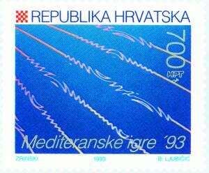 Motif: Stylized swimming tracks The Twelfth Mediterranean Games were held in France. In the centre of international sports competitions between the 16th and 27th of June in 1993 were 19 historical towns of the Languedoc-Roussillon province. The host of the Games has spent a billion francs in the construction and modernization of sports facilities to meet international requirements. In a wide-ranging sports programme, which includes 24 sports, 22 of which are Olympic sports, we saw 3 500 athletes from some 20 countries. Among them, our sportsmen represented for the first time the independent Republic of Croatia. The stamp was printed in sheets of 20 pieces each. HPT issued a first day cover and a commemorative sheet.