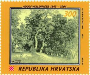 Motif: Slavonian oaks - pencil on paper Adolf Ignjo Waldinger (1843 - 1904) drew and painted the Slavonian woods and forests. He is a bridge in the history of modern Croatian painting between the Biedermeyer romanticism of the 19th century (Zasche and Karas) and the realistic generation of Quiquerez and especially Nikola Mašić. Yet at the same time Waldinger represents the last phase of Osijek 19th century painting in which landscapes were given special importance. He is a pure landscapist with a fine feeling for measure, and the observation of detail, and can evoke both atmosphere and reality. One encounters fantasy in his paintings too in which he differs from his predecessor and teacher H. Conrad von Hoetzendorf, breaking the ground for realism in Croatian painting. The stamp was printed in sheets of 20 pieces. HPT issued a first day cover (FDC) and a commemorative sheet.