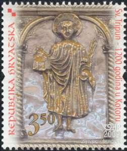 Image of a saint on the first postage stamp has its origins in the Statute and the Laws of the Town of Kotor from the year 1616, and the image of a saint on the second postage stamp is a depiction of a saint on the silver polyptych of the altar in the Cathedral dedicated to him.
