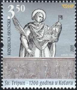 Image of a saint on the first postage stamp has its origins in the Statute and the Laws of the Town of Kotor from the year 1616, and the image of a saint on the second postage stamp is a depiction of a saint on the silver polyptych of the altar in the Cathedral dedicated to him.