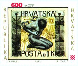 Motif: reproduction of the pattern by R. Sabljak and R. Valić, dedicated to the Croatian commemorative stamp "29 October 1918" - the drawing of the slave is by Rudolf Sabljak and the frame with national ornaments is by Rudolf Valić This year the Croatian Post and Telecommunications will mark the Stamp Day by issuing special stamps to commemorate two significant days in the history of the Croatian Post: 9 September was chosen as a Stamp Day to mark the issuing of the first regular postage stamp of the Republic of Croatia in 1991. The motif on this special stamp is based upon the original drawing for another special stamp that was issued a month after the decision of the Croatian Parliament to break all legal and government connections with the Austro-Hungarian Empire (the stamp was issued in various nominal values and slightly altered shape on 29 November 1918) The stamp was printed in sheets of 20 pieces each. HPT issued a first day cover (FDC) and a commemorative sheet.