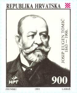 Motif: portrait of Josip Eugen Tomić Josip Eugen Tomić was born on October 18, 1843 in Požega where he spent the first fifteen years of life and completed his elementary education. The beauty of his native town, the rich life and the strong echoes of the Croatian National Movement left a deep impact on the mind of the young man, who was soon to become one of the most popular Croatian writers of his time. His "Pošurice" published in 1887 displayed a remarkable insight into the peculiarities and humorous aspects of the life in the provinces. In 1879 Tomić published his first historical novel "Zmaj od Bosne" (The Dragon from Bosnia). The assignment to finish Šenoa's novel "Kletva" (The Curse) increased Tomić's interest for historical themes and he produced several historical novels such as: "Kapetanova kći" (The Captain's Daughter), "Emin-agina ljubav" (Emin-agha's Love), "Za kralja-za dom" (For the King-For the Homeland, vol l, ll) ... Versatility, literary skill and the purity of his language, his devotion to his readers and his patriotism are the main features of Josip Eugen Tomić's work. The stamp was printed in sheets of 20 pieces each.