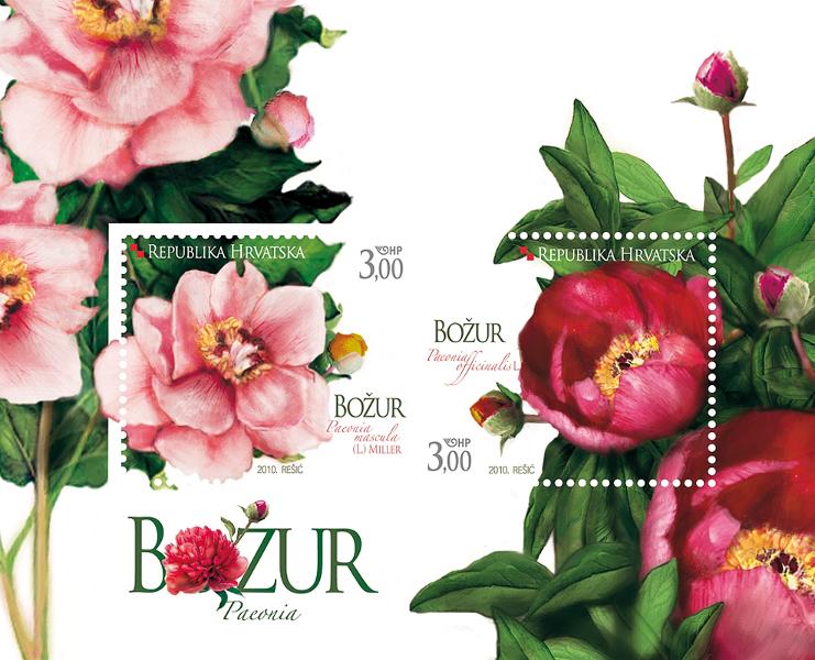 Motif: Croatian peony sorts The family of peony (Paeoniaceae) is composed of only one genus of about thirty herbaceous and about ten woody tree peonies spread mostly in hilly and mountainous areas in temperate zones of the north hemisphere. The Latin name of the genus, Paeonia, is derived from the name of Paeon, a mythical physician highly respected among Greek Gods. The Paeon’s teacher Asclepius, the God of medicine and pharmacy, became jealous of his pupil and intended to kill him. For that reason Zeus hid the young physician turning him into a curative plant with nicely smelling flowers – which, after him, was named Paionia (Peony). For thousands of years the symbolics of peony has been present in mythologies and legends of many peoples of Europe, Asia and North America: the peony is especially respected and admired in China and Mongolia. Croatian Flora includes three species and several subspecies of peony - all of them strictly protected by the law. Wild Peony (Paeonia mascula (L.) Miller), known among people as the «male» peony, is a Tertiary relic (the remainder of pristine Flora before Ice Age) a very rare plant also in Croatia, protected by the law even since 1958. It is a perennial plant, 80 cm high, with tuberous, thickened roots. Numerous, not branchy stalks are upright and bare, overgrown by leaves to the top, on which only one flower develops. The leaves are threefold, composed of integral, shiny, green leaflets. The flowers, up to 10 cm in diameter, have many yellow stamens surrounded by five petals, in colours from pink to purple. The number of petals can sometimes spontaneously increase and all the cultivars have “full” flowers (the so called flore pleno, fl.pl.) with numerous petals. The Wild Peony blossoms in April and May in sunny habitats of bright and warm woods and shrubberies, at higher altitudes. As curative plant the wild peony is in some areas used in veterinary and human medical care and is a very popular decorative plant. Rare in Croatia is Common Peony (P. officinalis L.), known also as the «female» peony, because of its fragile structure. It reaches up to 60 cm, has leaves composed of leaflets split in three parts and dark red flowers with five petals. It grows in bright woods and on grassland, usually on limestones from France to Albania. In spite of its toxicity the common peony has been used in folk medicine for more than 2000 years as an effective remedy against convulsions, and today is mostly used in homeophatic remedies. It has been grown for centuries primarily for its curative properties but also for its beauty: one of the oldest cultivars in our gardens is Rubra Plena, a very nice plant with full, red flowers with numerous petals. Like other sorts of peony, also our sorts can be found in cultivation throughout the world, appreciated as exceptionally beautiful and long-lived decorative plants: if their root is not disturbed and the temperature does not drop below -15 oC, the peony in cultivation lives up to 50 years and develops into a quite impressive bush. Several hundreds of cultivars (sorts) of different peony species are known, which are in horticulture divided according to their flower shape (simple, double, or multiple petals) and their size (small, medium, large). Many species and cultivars – apart from magnificent flowers, are also favoured with pleasant smell, coloured leaves or prominent fruit, which makes them an irreplaceable part of flower beds of herbaceous perennials in temperate zones of all continents. Sanja Kovačić