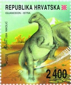 Although animal fossils have been studied for centuries, the dinosaurs remained mostly hidden until rather recently. In the 1840s, when Sir Richard Owen was studying the reptile fossils discovered in England, he concluded they could not be compared to the living reptiles. He hypothesized that their size and appearance must have been fearsome and thus coined the word "dinosaur" from two Greek words "deimos" (fearsome) and "sauros" (reptile, lizard). The first dinosaurs appeared about 230-225 million years ago and were to dominate the earth for almost 170 million years. They suddenly vanished 65 million years ago at the turn of the Jurassic period to the Cretaceous period. The dinosaur footprints discovered in Istria on different locations have not been subject to thorough investigation, such as the island of Fenoliga, the island of Veli Brijun, the Červar Bay, the river mouth of Mirna. The Location on the sea floor south of Rovinj is the only coastal site in Istria and in the Mediterranian basin. 1994 marks the beginning of an interdisciplinary joint research project carried out by the scientists from the Zagreb Institute of Geological Research and experts from institutes and Faculties in Croatia and Italy. The objectives of these investigations are animal fossils and their ancient habitats-i.e. the paleoecological situation in the period when Istria was the habitat to dinosaurs. The Croatian Post and Telecommunications issued a First Day Cover and a First Day Sheet.