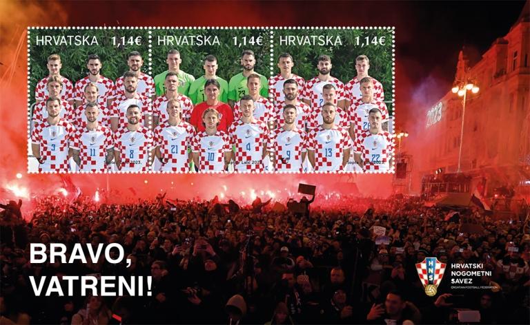 | Description: | Motifs: photograph of the Vatreni in official national football team jerseys and their welcome at Ban Jelačić Square 2022. godine The stamp was issued in a souvenir sheet of three stamps, and the Croatian Post has also issued a First Day Cover (FDC). The souvenir sheet was issued in collaboration with Croatian Football Federation |