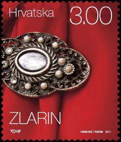 Zlarin je otočić šibenskoga arhipelaga koji još nazivaju i „otok koralja“ jer se od 15. stoljeća ovdje razvijao lov i obrada bijelih i crvenih koralja. Iako malen površinom, otok je značajan po svojim povijesnim spomenicima. Jedan od važnijih je matrikula pučke bratovštine crkve Gospe od Rašelja pisana na čakavštini iz 1456. godine. Još sedamdesetih godina na Zlarinu su starije žene bile odjevene na isti način kakav je zabilježen na slikama s početka 20. stoljeća. Temeljno ruho čini duga platnena košulja, a kao gornji dijelovi odjeće modri ili crni prsluk s crvenim obrubima te duga nabrana suknena suknja od vunene tkanine smeđe ili crne boje, često s crvenim optokom iznad poruba. Suknja se na prsima jako steže i produžuje u naramenice od crvene vrpce pa pripada tipu tipične mediteranske zvonolike suknje s poramenicama. Oko pasa nabori su učvršćeni šarenim vunenim pojasom za koji se zaticao rupčić. Udane žene glavu su povezivale bijelim rupcem, a djevojke su nosile pletenicu s uvijenom crvenom vrpcom ovijenu oko glave. Život na hrvatskim otocima i jadranskom području bio je skroman, ali je zbog trgovine i pomorstva od najranijih razdoblja slijedio modne trendove koji su se očitovali i u nakitu. Mlađe žene i djevojke kite se zlatnim i srebrenim nakitom s umetnutim poludragim i dragim kamenjem. Nakit su izrađivali vrsni domaći i strani majstori u starim tehnikama lijevanja, cizeliranja, filigrana, granulacije, umetanja. Zbog svoje vrijednosti nakit je nasljeđivan s generacije na generaciju unutar uže i šire obitelji. Najviše su nošene raznoliko oblikovane naušnice te vratni i prsni nakit koji čine kraće ili dulje zlatne ili koraljne ogrlice s privjescima, zatim broševi i ukrasne igle kojima se obično zatvarao prsni otvor na košulji.