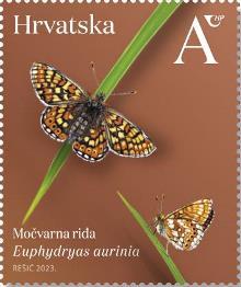 Močvarna riđa Močvarna riđa (Euphydryas aurinia) jedna je od najprepoznatljivijih vrsta iz porodice šarenaca (Nymphalidae). Dobila je ime prema tipu staništa na kojem najčešće boravi, a to su vlažne livade. U Hrvatskoj su poznata dva ekološka tipa vrste – populacije koje nastanjuju vlažne travnjake kontinentalne regije te populacije suhih travnjaka alpske i mediteranske regije Hrvatske. U kontinentalnoj regiji populacije su obično izolirane s fragmentiranim pogodnim staništima. Uništavanje takvih manjih vlažnih staništa i promjene u vodnom režimu najizraženija su prijetnja kontinentalnog područja koja može dovesti do lokalnog izumiranja vrste. U alpskoj i u mediteranskoj regiji populacije su veće i prisutne na većim pašnjacima i travnjacima, a gdje je sukcesija uzrokovana smanjenjem ekstenzivne ispaše glavna prijetnja. Najnovija istraživanja potvrdila su prisutnost vrste u gotovo svim povijesno poznatim područjima te brojnim novim lokalitetima u svim regijama Hrvatske, uz brojne populacije diljem dalmatinskog zaleđa. Staništa su močvarne riđe vlažne vapnenačke otvorene livade s biljkama hraniteljicama iz rodova zvjezdoglavki (Scabiosa), prženica (Knautia), zečina (Centaurea), kozokrvina (Lonicera), trpuca (Plantago), dubačaca (Teucrium), kao i livadni preskoč (Succisa pratensis). Biljke hraniteljice gusjenice su žuti srčanik (Gentiana lutea), šumska kozokrvina (Lonicera periclymenum), golublja zvjezdoglavka (Scabiosa columbaria) i dr. Ženke biraju veće, istaknutije biljke hraniteljice ili manja područja niže vegetacije gdje je brojnost biljaka hraniteljica vrlo visoka. Ženka polaže do 350 okruglih jajašaca žute boje u gomilicama na donju stranu listova, iz kojih krajem srpnja izlaze gusjenice. Gusjenica je tamne osnovne boje do crne s istaknutim četinama po tijelu. Gusjenice se u početku razvoja ne hrane solitarno već kolonijalno u malim svilenim mrežama. Močvarna riđa od rujna prezimljuje kolonijalno u četvrtom stadiju gusjenice u zimskim hibernacijskim mrežama, svom svilenkastom skloništu. Krajem ožujka sljedeće godine, a nakon hibernacije, četvrti stadij gusjenice prekida „skupno” hranjenje tako da se u petom i šestom stadiju gusjenice hrane pojedinačno. Od kraja travnja do početka svibnja vrsta živi u stadiju kukuljice iz koje u prvom ili drugom tjednu svibnja ovisno o klimatskim prilikama izlijeće odrasli leptir – reproduktivna razvojna faza. Močvarna riđa ima jednu generaciju godišnje, a imago leti od travnja do srpnja. Na području Hrvatske močvarna riđa najčešće se može vidjeti u svibnju i lipnju. Vrsta je ugrožena nestankom staništa zbog sukcesije, isušivanja livada uslijed promjene vodnog režima ili intenziviranja poljoprivredne proizvodnje. Na smanjenje brojnosti populacije u velikoj mjeri utječu i parazitoidi reda opnokrilaca (Hymenoptera). Močvarna riđa je zaštićena Zakonom o zaštiti prirode u kategoriji strogo zaštićene zavičajne divlje svojte. Nalazi se na Dodatku II. i IV. Direktive o očuvanju prirodnih staništa i divlje faune i flore (Council Directive 92/43/EEC), a cilj je očuvanje na 26 područja Ekološke mreže Republike Hrvatske.