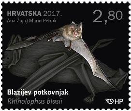 Blazijev potkovnjak, Rhinolophus blasii Peters, 1866. Šišmiš iz porodice potkovnjaka (Rhinolophidae) koji svi imaju karakteristične kožne izrasline po kojima se razlikuju od ostalih porodica te međusobno. Blazijev potkovnjak najrjeđa je vrsta potkovnjaka u Hrvatskoj. Osim nalaza na otocima Cresu, Krku i Rabu, ograničen je na podzemna skloništa (špilje i jame) u unutrašnjosti Mediteranske regije. Kako se vrsta smatra izumrlom u Sloveniji i Italiji, nalazi u Hrvatskoj predstavljaju sjevernu granicu ove širokorasprostranjene, ali rijetke vrste. Specifični eholokacijski signali visoke frekvencije jasna su determinacijska karakteristika vrste te služe za orijentaciju i lov kukaca. Za lov koristi nisko raslinje (grmlje) i šume, čije uništavanje – zajedno s uznemiravanjem i uništavanjem podzemnih skloništa – ugrožava ovu vrstu. Za očuvanje vrste ključna je zaštita podzemnih objekata u kojima se nalaze zimske i ljetne kolonije te odgovarajućih lovnih staništa.