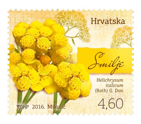 Smilje Helichrysum italicum (Roth) G. Don., porodica glavočika (Asteraceae) engl. curry plant njem. italienische Strohblume franc. l'immortelle d'Italie tal. l'elicriso italiano Smilje je aromatičan, pri bazi drvenast polugrm visine oko pola metra. Mlade grančice prekrivene su dlačicama, a linearni listovi često su bijelopustenasti. Zlatnožute cvjetne glavice (latinski naziv roda potječe od grčkih riječi helios, sunce, i chryson, zlatan) promjera su oko 3 mm, građene od sitnih cjevastih cvjetova i okružene pricvjetnim listovima. Više glavica skupljeno je na vrhovima grančica u štitaste cvatove promjera do 10 cm. Smilje cvate od travnja do srpnja na osunčanim, otvorenim površinama, većinom na kamenjarskim travnjacima i u bušicima. Prava je sredozemna biljka rasprostranjena čitavom južnom Europom, sjeverozapadnom Afrikom i Malom Azijom. Poznato je više podvrsta smilja koje se međusobno razlikuju visinom rasta i veličinom listova. Iako oduvijek cijenjeno kao ljekovito, smilje je tek posljednjih godina postalo iznimno popularno diljem svijeta te su njegova prirodna staništa i u Hrvatskoj često izložena nesmiljenom uništavanju. Od cvjetnih glavica destilacijom se dobiva svijetlo ulje ugodna mirisa i široke primjene u farmaceutskoj i kozmetičkoj industriji. Sadrži čitavo mnoštvo gorkih kemijskih spojeva (ftalidi, flavonoidi) povoljnih u liječenju različitih kožnih bolesti, ozljeda i poremećaja: od učinkovitih obloga za opekline i porezotine do „čarobnih“ pripravka koji uklanjaju bore. Rabi se i u alternativnim načinima liječenja, od aromaterapije do homeopatije. Parfemska industrija upotrebljava ulje od smilja kao temeljnu otopinu (fiksativ) kojoj se zatim dodaju različiti drugi mirisi. Proizvođači hrane dodaju ga žvakaćim gumama, slatkišima, sladoledima i pekarskim proizvodima. U malim količinama listovi smilja mogu se dodati različitim mesnim i ribljim jelima mediteranske kuhinje, juhama, varivima i svježim salatama, a cvatovi i čajnim mješavinama. Cvjetne glavice smilja također se dodaju sušenim cvjetnim aranžmanima jer dugo zadržavaju zlatnožutu boju. I različite druge vrste tog velikog roda popularne su kao „slamnato cvijeće“ od kojeg je dobiveno mnoštvo uresnih kultivara različitih boja, a neke se sorte uzgajaju i kao malene živice (biljka dobro podnosi orezivanje). Sanja Kovačić