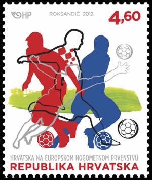 Tri siluete u nacionalnim bojama na našoj prigodnoj marki kao da simboliziraju i tri nastupa hrvatske nogometne reprezentacije na dosadašnjim europskim prvenstvima. Možemo im dati i jasnije obrise te ih prispodobiti likovima trojice igrača, primjerice Davora Šukera, Dade Prše i Luke Modrića, kao perjanicama tih naraštaja. Prvi je put Hrvatska sudjelovala na EURU 1996. godine u Engleskoj. Predstavljala je pravo osvježenje i obogaćenje „stare“ kontinentalne scene i u nogometnom, igračkom smislu, ali i u onom pojavnom, koloritnom. Momčad koju je vodio karizmatični izbornik Miroslav Ćiro Blažević plasirala se u četvrtfinale. Takozvani Vatreni su u skupini pobijedili Tursku (1 : 0) i Dansku (3 : 0), a izgubili od Portugala (0 : 3). Posebno je odjeknuo trijumf nad tada aktualnim europskim prvacima, Dancima. Pamti se i po antologijskom Šukerovu pogotku kada je velemajstorskim lobom na pleća položio gorostasnog vratara Petera Schmeichela. U četvrtfinalu naši su izgubili od konačnog pobjednika Njemačke (1 : 2), zahvaljujući podosta i neobjektivnosti švedskog sudca. U kolijevci nogometa Hrvati su stekli simpatije zbog svoga nogometnog umijeća, a zajedno s navijačima i zbog živopisnih kockastih crveno-bijelih dresova i drugih simbola. Posebno tražene bile su kape – da smo ih, umjesto samo stotinjak, donijeli i 5000 – sve bi „planule“! Generacija s kapetanom Zvonimirom Bobanom na čelu, poznata i pod nadimkom „Čileanska“, a od Svjetskog prvenstva 1998. i „Brončana“, nije se kvalificirala za EURO 2000. u Belgiji i Nizozemskoj. Na EURU 2004. u Portugalu selektor Otto Barić i njegove glavne uzdanice, Dado Pršo, braća Kovač, Igor Tudor..., zapeli su u skupini. Mršavi remi sa Švicarskom (0 : 0) i blistavi, obećavajući s Francuskom (2 : 2), međutim, ošamućujući poraz od Engleza (2 : 4) s Wayneom Rooneyjem u glavnoj ulozi. EURO 2008. u Austriji i Švicarskoj – ponekad se činilo da igramo u Zagrebu ili Splitu, a ne u Grazu ili Beču jer su u tolikom broju naši navijači preplavili gradove domaćine. Izbornik Slaven Bilić proveo je svoje poletne „boyse“ pobjedonosno, s maksimalnim učinkom, kroz prvu fazu. Rashladio je domaćine Austrijance (1 : 0), deprimirao trostruke europske prvake Nijemce (2 : 1) i obavio lako, s pričuvnim sastavom, formalnost s Poljacima (2 : 0). A onda je došla na red ta famozna, neponovljiva četvrtfinalna utakmica s Turskom. Sekunde su doslovce dijelile Stipu Pletikosu, Luku Modrića, Darija Srnu, Vedrana Čorluku, Ivicu Olića i ostale Vatrene od polufinala. Turci su Klasnićevo vodstvo iz 119. minute anulirali u posljednjim trenutcima nastavka i dotukli naše šokirane junake na jedanaesterce (1 : 3). S Turskom je ovaj naraštaj nesretno završio EURO prije četiri godine, s Turcima je slavodobitno okončao kvalifikacije za EURO 2012. u doigravanju 3 : 0 u Istanbulu i 0 : 0 u Zagrebu. Kvalifikacije su to u kojima je bilo oscilacija i velikih padova – 0 : 1 s Gruzijom u Tbilisiju i 0 : 2 s Grčkom u Ateni. Evo nas i na EURU 2012. u Poljskoj i Ukrajini, u završnici turnira koji nogometni stručnjaci s razlogom smatraju kvalitetnijim od Svjetskog prvenstva. Tu nema slabih i „zalutalih“. Protivnici u skupini su Irska, Italija i Španjolska. S nadobudnim Ircima, koje na uzdi drži prekaljeni talijanski strateg Giovanni Trapattoni, može biti i teže nego s Azzurrima i Furiom. Jer Vatreni, kako nam govori iskustvo, bolje igraju protiv skupih „maraka“, poput Gianluigija Buffona, Andrea Pirla i Antonija Cassana u redizajniranoj talijanskoj selekciji ili protiv Ikera Casillasa, Carlesa Puyola, Xavija i Inieste, španjolskih asova prezasićenih trofejima. Bilićeva družina, ojačana i gorkim iskustvima, na krilima kapetana Darija Srne i fantaziste Luke Modrića voli takve izazove. Španjolci brane naslov, glavni su favoriti, a Nijemci s pravom streme svom četvrtom trofeju s EURA. A Hrvatska? Može li do medalje ili čak do kraja?! Bilo bi to manje iznenađenje nego Danska kruna 1992. ili Grčka 2004. godine. No važno nam je opravdati ugled nogometne nacije, predstaviti se srčanom i pametnom, znalačkom igrom. To možemo i moramo. Miroslav Rede