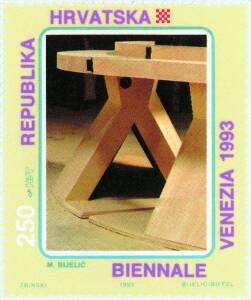 Motiv: Milivoj Bjelić "Homodukt" 1986-1993. Uoči stote obljetnice Biennala Republika Hrvatska predstavila se po prvi put samostalnim nastupom na toj prestižnoj manifestaciji suvremene likovnosti, u prostoru negdašnje crkve San Giovanni Nouvo, današnjem muzeju Guidi. Trojca autora, u izboru selektora Igora Zidića - Milivoj Bjelić (Zagreb, 1951.), Ivo Deković (Šibenik, 1952.) i Željko Kipke (Čakovec, 1953.) - formirana su u različitim životnim i radnim sredinama, a danas su nedvojbeno zreli umjetnici koji svojim dijelom svjedoče i aktualni likovni trenutak i dosluh s prošlim epohama, potvrđujući istodobno i svojevrsni nomadizam i okovanost zavičajem. Oni progovaraju jezikom karakterističnim za kraj našeg stoljeća, no ipak u univerzalnoj homoglosiji vremena ne gube smisao za "dijalektalne razlike" i individualne nijanse. Marke su tiskane u arčićima od 4 marke i arcima od 20 maraka. HPT je pustio u prodaju prigodnu omotnicu prvog dana (FDC) i prigodni list.