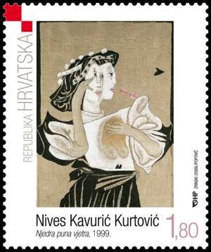 Nives Kavurić Kurtović, „Njedra puna vjetra“, 1999., ulje na platnu, privatno vlasništvo Rođena je u Zagrebu gdje je i diplomirala 1962. godine na Akademiji likovnih umjetnosti. Riječ je o slikarici neobične izražajnosti uvijek sklonoj nadrealističkim fantazmagoričnim prikazima. Iznimno je važna i kao crtač, odnosno grafičar.