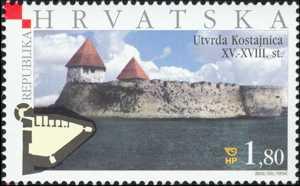 Marke su tiskane u arcima od 20, a izdana je i omotnica prvog dana (FDC). HRVATSKA KOSTAJNICA Hrvatska Kostajnica smjestila se uz obalu rijeke Une u podnožju brda Djeda. Ime Kostajnica prvi se puta spominje 1240. godine u povelji izdanoj u Dubici. U 15. stoljeću se prvi puta spominju njezine utvrde (1440), kada se spominje kaštel na unskom otoku. U svojoj bogatoj povijesti bila je i u posjedu Frankopana (1442), pa Zrinskih u 16. soljeću, koji su od Kostajnice napravili “vrata” Hrvatske. Pod tursku vlast pala je 1556. godine osvajanjem kostajničkog kaštela, i od tada služi za obranu granice na Uni. Kao i većina banovinskih naselja, Kostajnica potpada pod carsku upravu od 1699., i od ranog je 18. stoljeća u sklopu Vojne krajine. Zbog svoje važnosti graničnog grada, trgovačkog središta i prometnog čvorišta, kostajnička će se utvrda pojačavati. Već 1702. inženjer Tiell daje prijedloge za građevinske radove, i traži da se na unskom otoku poprave stare utvrde, ali i sagradi kuće i zgrade od drveta za vojsku, te sve ogradi palisadama. Kaštel je ralativno malen u odnosu na druge utvrde, ali je sav dobro zaštićen vodom sa svih strana, a nad njim se osovio visoki brijeg do kojega vodi most. Na bosanskoj strani nalazi se jedna čvrsto građena kula. Sam utvrđeni grad ima poligonalni oblik i građen je na jakim kamenim temeljima. Na zidinama se ističe velika polukružna kula sa strijelnicama, te dvije jake četverokutne kule. Kako, međutim, obrana pred Turcima nije mogla biti efikasna samo kaštelom na otočiću, već se tada pomišljalo na dograđivanje utvrde na brdu Djed nad gradom s hrvatske strane. Nad mjestom, na uzvisini Djed, još je početkom 18. stoljeća stajala kvadratna utvrda s čardakom u središtu. Uskoro je počela dogradnja šiljastih bastiona na uglovima i revelina. No, kao i drugdje na području vojne krajine, 1735. godine F. du Portal de Monteau počinje gradnju nove utvrde, u koju su bili integrirani i stariji dijelovi. Međutim utvrda nije bila dovršena prema projektu, kako to svjedoče današnji ostaci. Ona je asimetričnog oblika jer nije izgrađen sjeveroistočni polubastion, a čini se da je krajem 18. stoljeća već bila zapuštena. Danas se unutar izletišta s parkom vide znatni ostaci utvrde.