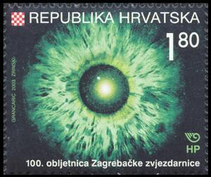 Marke su izdane u sutisku u arku od 10 maraka (5 x 2) naizmjenično, a izdana je i omotnica prvoga dana (FDC). 100. OBLJETNICA ZAGREBAČKE ZVJEZDARNICE Zvjezdarnica na Popovom tornju u zagrebačkom Gornjem gradu svečano je otvorena 5. prosinca 1903. godine. Prvi upravitelj Zvjezdarnice bio je Oton Kučera koji je već tada izrazio njene temeljne djelatnosti: da doprinosi napredovanju nauke i da hrvatskoj inteligenciji i mladosti širi rezultate nauke. Ugledu Zvjezdarnice pridonio je hajdelberški astronom August Kopff, imenovavši planetoid br. 589 (otkriven 1906. godine), Croatia, u čast otvaranja Zvjezdarnice. Zvjezdarnica je od samog početka intenzivirala rad na promicanju znanstvenih spoznaja među građanstvom i mladeži, da bi vremenom popularizacija astronomije i srodnih znanosti, te stalna potpora školskoj astronomiji, postale njene osnovne djelatnosti. 50-ih godina dvadesetog stoljeća Zvjezdarnica je putem svojih esperantskih izdanja postala poznata diljem svijeta. Na esperanto je prevođen časopis Čovjek i svemir (Homo kaj Kosmo), znanstveno-fantastično djelo mladih astronoma Drama u svemiru (Tragedio en la Universo), publikacija o Međunarodnom (esperantsko-astronomskom) kampu prijatelja mira, organiziranom u Primoštenu i drugo. Te su akcije bile i dio šire humanizacije znanosti. U vremenu povećanoga zanimanja za astronomiju, zbog uspješnih letova sovjetskih i američkih letjelica u svemir, pristupa se novim oblicima rada: organiziranju ljetnih astronomskih škola, školskih natjecanja iz astronomije, kampova, tečajeva, astronomskih ekspedicija i opažanja, a nabavkom novog, elektrificiranog teleskopa, 60-ih godina omogućen je kvalitetniji stručni i popularizatorski rad. Danas se u Zvjezdarnici okuplja mnoštvo ljubitelja astronomije i prirodoslovlja. Tradicijskim programima za građanstvo (predavanja, promatranja neba i drugo) Zvjezdarnica je potvrdila kulturološki doprinos životu grada Zagreba. Godine 1995. pokrenut je, u okviru Hrvatskog prirodoslovnog društva, projekt e-škole iz prirodoslovlja. Za područje astronomije ovaj se projekt realizira u Zvjezdarnici. S obzirom na opažačke mogućnosti, stručni rad usmjeren je na redovito praćenje Sunčeve aktivnosti i povremenih astronomskih pojava. Znanstveni rad se odvija u području fizike Sunca i oslanja se na međunarodnu suradnju. Zvjezdarnici je 1998. godine dodijeljena Državna nagrada tehničke kulture "Faust Vrančić". dr. Dragan Roša