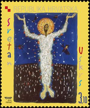 Motiv: „Krist Kralj“, Ivo Dulčić, 1957., tempera na kartonu Skicom Ive Dulčića za golemu fresku uskrsloga Krista u crkvi Gospe od Zdravlja u Splitu Hrvatska pošta ove godine obilježava najveći kršćanski blagdan. To je blagdan koji svemu daje smisao: ne samo zato što patnji obećava kraj, a podnesenoj nepravdi zadovoljštinu nego zato što dovodi u pitanje pojam ograničenog i konačnog. Beskonačnost je njegov smisao, beskonačnost u kojoj ovostrani uzroci susreću svoje neumitne onostrane posljedice. Nije to blagdan lakih obećanja. On uključuje smrt i sud, ali podsjeća na milost i ljubav. Upravo u vrijeme nastanka ovoga Dulčićeva djela filozofija egzistencijalizma bavila se ostvarenjem beskonačnog u ovostranom hipu. Stil informela, rastvarajući tvar na čestice, bio je neka vrsta vizualnog, prostornog pandana takvu doživljaju vremena. Ivo Dulčić sigurno je najvažniji predstavnik toga stila u hrvatskom slikarstvu. Svaka čestica njegove slikarske tvari kao da živi oslobođeno, svaka gesta kao da vrti svjetove. Vrhunac svoga djela ostvario je vjerojatno u ciklusu vitraja u franjevačkoj crkvi na zagrebačkom Kaptolu. I ova njegova freska u splitskoj crkvi Gospe od Zdravlja, iz 1959., nosi vidljiva obilježja svoga vremena. To je kompozicija do kraja subjektivne prostornosti, gdje se dubina nastoji sastati s visinom osvajajući je plohom; gdje je lik Krista, obezmjereno golem prema svemu što ga okružuje, a osobito prema čovječanstvu dolje duboko, asimetrično izlomljen da bi tim lomovima dosegnuo vrhunac izražajnosti. Ta masa čovječanstva u dubini ostvarena je nizom točkica, mravastim oblicima koji se zbrajaju u neko kolektivno biće, u ono «mi» koje je stajaći subjekt informelnoga pjesništva. Protuteža tom zemaljskom mravinjaku modar je nebeski prostor u kojemu veliki, trajniji znakovi, znakovi evanđelista i likovi zviježđa, u međuzoni prema nevidljivu boravištu Božjem, predstavljaju višu fazu rukopisa i pisma. Krist je tako golem, a čovječanstvo tako razmrvljeno jer je osnovni sadržaj slike zbrajanje. Sve se zbraja u Kristu. Ni najmanja pojedinost svijeta nije iz njega izostala. Sve on vodi na nebo, na onu stranu, jer je platio cijenu u koju je baš sve uračunao. Ta golema intuicija Ive Dulčića iskazana je krajnjom jasnoćom, bez potrebe da opisno objašnjava. U tome je smisao slike, povlastica nepismenih: njihova je Biblija munjevita. I tako ovoga godišta s Dulčićem i mi krećemo u dublje razumijevanje. Željka Čorak