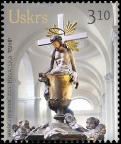 USKRS 2015 Na rovinjskoj akropoli nalazi se prekrasna i drevna crkva svete Eufemije. Na mjestu prastare male bogomolje, sa sarkofagom i zemnim ostacima starokršćanske mučenice, s pogledom na osunčano more, do današnje impozantne veličine i raskošne opremljenosti narasla je u doba baroka. Premda je u vrijeme Napoleonovog osvajanja ostala bez znatnog dijela svoje bogate riznice, još je uvijek puna dragocjenih umjetnina od kojih su neke djela poznatih majstora, a druge iz anonimnosti govore jasnim stilskim jezikom svoga doba. Među ovim potonjima valja spomenuti posebno zanimljiv procesijski inventar, nekoliko baroknih drvenih kipova ili skupina kipova na visokim štapovima. Ti kipovi stoje u bočnim kapelama i povezani hodom po crkvi tvore cijelo malo kazalište. Taj je dojam dakako još snažniji ako se zamisle u pokretu, uzdignuti iznad mase ljudi, kako se poput svetih lutaka gibaju u svečanostima i svojim zlatom i srebrom razgovaraju sa svjetlom i osvjetljuju polutamu. Najneobičniji među tim kipovima može se vezati uz Uskrs. Na to naime upućuje njegova rijetka i izravna metaforičnost. Iz zlatnog kaleža, poput žive hostije, uzdiže se od pojasa naviše, moglo bi se reći izranja, Kristovo tijelo. Krist je naslonjen na križ sa zlatnim zrakama, a rukama drži svoju perizomu koja se, pretvarajući se u barokni ornament, prelijeva do anđelčića u dnu kaleža. „Uzmite, jedite, ovo je tijelo moje“ umjetnik je od transformacije u kruh i stilizacije u hostiju vratio u realistično polazište. Dvostrukim obratom ne čita se hostija kao tijelo, nego tijelo kao hostija. Jednako tako, u istom ključu, ono iz čega izranja Kristovo tijelo, ono u kaležu, nije vino, nego krv. Kalež je naravno žrtvena posuda, posuda transsupstancijacije, a ono što u njoj nastaje diže se u visinu, pokazujući put. U toj visini, visini oslobođenja, iskazan je ujedno i smisao žrtve. Taj smisao i to obećanje jest Uskrs. U našim crkvama, često i ne na glavnim oltarima, nego negdje po strani, ponekad i u zakutcima, nalaze se neočekivane divote. Takva je i ova umjetnina iz rovinjske svete Eufemije. Uskrs i Božić, dva najveća kršćanska blagdana, pružaju poticaj i mogućnost da se na markama pokažu rijetkosti i vrijednosti iz cijele Hrvatske. Ovaj put iz Istre Hrvatska pošta upućuje u svijet najdublju uskrsnu poruku. Željka Čorak
