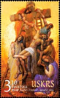 Božić i Uskrs vezani su svjetlošću. Na Božić Bog se rađa kao „mlado sunce“, sabirući u sebi prastare znakove i značenja obnove zemlje. On dolazi iz svjetla visokih sfera da postane svjetlo svijeta. Na Uskrs, to svjetlo koje je bilo uronilo u zemljinu tamu, iz smrti se vraća da sine uzlaznim putem svoga vječnog sjaja. U crkvi Bezgrješnog začeća Marijina, u Dubravama kod Brčkog, splitski slikar Mile Skračić naslikao je svoje vjerojatno najbolje djelo, četrnaest postaja Križnoga puta. Na svima, tako i na ovom „Skidanju s križa“ – kojim Hrvatska pošta obilježava ovogodišnji Uskrs – podloga je zlato velikoga sunca. Ono, makar nemirnom slikarskom tvari i potezom, napominje apstraktni, beskonačni prostor (više beskonačno trajanje nego prostor) predrenesansnih slika. Svojim otvorenim okom („kom se sakrit ništa ne da“), kao golemom lećom, prati i pamti sva zbivanja na putu što se do danas odvija i ponavlja pred našim očima. Mile Skračić (1933. – 2013.) završio je Školu za primijenjenu umjetnost i Pedagošku akademiju u Splitu, a zatim diplomirao na Akademiji likovnih umjetnosti u Zagrebu, kod profesora Šime Perića. Dotaknutog duhom informela, zanimala ga je materija kao sadržaj slike, zatim dodir materije i tehnoloških biljega – odnos prirode i civilizacije. Sve ga je na kraju upućivalo na osnovnu pozornicu drame, na ljudsko tijelo, pa je tako i njegov ciklus „Ranjeni krajolici“ zapravo niz pejzaža tijela. A tijelo je onda potražilo svoje čvrste i trajne simbolične kalupe, to jest ulilo se u predloške svetih bića i svetih prizora. U toj sakralnoj tematici Skračić je ostvario niz izvanrednih djela. On je neporecivo modernim idiomom izvršio tradicionalne figurativne zadaće, oblikovao sakralne prizore koji su dojmljivi i čitljivi poput djela starih majstora, a opet djeluju vlastitom redukcijom pojedinosti, zbirnijim pogledom i slobodnim, pa i dramatičnim rukopisom. Posebno Milu Skračića sa starim majstorima veže bogata i izražajna artikulacija scena. Skračić se u dramaturgiji slika nikad nije štedio, i njegovo „sveto kazalište“ raspolaže besprigovornom anatomijom, neiscrpivim repertoarom scenskih pokreta, brižnom režijom, maštovitim kompozicijskim mijenama. Njegov jaki, ali lirski kolorizam prikladno odsijeva na zlatnoj podlozi. Sve se to čita iz ovoga „Skidanja s križa“. Pet likova spušta Isusovo ukočeno tijelo. Možemo se obratiti evanđelistima i za tri lika pretpostaviti tko su: svi spominju Josipa iz Arimateje, a Ivan dodaje i Nikodema. Uz podnožje križa nemoćnu, mrtvu ruku Krista hvata ženski lik – kretnjom i stavom koji upućuju prije na Mariju Magdalenu nego na Isusovu majku. Vješta piramidalna kompozicija, križa, isprepletenih tijela i dviju ljestava, tvori jednu bolnu grudu, bolni grč, koji bi bilo teško podnijeti kad sunce iza svega ne bi pronosilo svoje svjetlosno obećanje. dr. sc. Željka Čorak, znanstvena savjetnica – emerita u Institutu za povijest umjetnosti